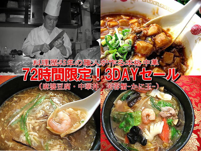 【72時間セール】中華丼・麻婆豆腐・フカヒレ入り玉子スープ価格: 1,050円レビュー評価: 4.49 レビュー数:37 商品内容 【商品名】 72時間限定“3”DAYセール (中華丼・マーボ豆腐・フカヒレ入り玉子スープ) 【保存方法】 冷凍庫(-18度以下)で保存して下さい 【賞味期限】冷凍庫にて1ヶ月 【調理方法】 沸騰したお湯で温めてお召し上がりください。 発送方法 冷凍便 他の商品との同梱 可能です 運送会社 佐川急便 ※沖縄・離島は日本通運 送料 全国一律 800円 ※沖縄・離島は別途500円必要 1位 人気ランキング中華福袋 人気のあるベスト5をオトクな福袋に!!気になる中身は人気1位「四川風麻婆豆腐250g」2位「海老のチリソース140g」3位「海老の中華マヨネーズ140g」4位「八宝菜200g |